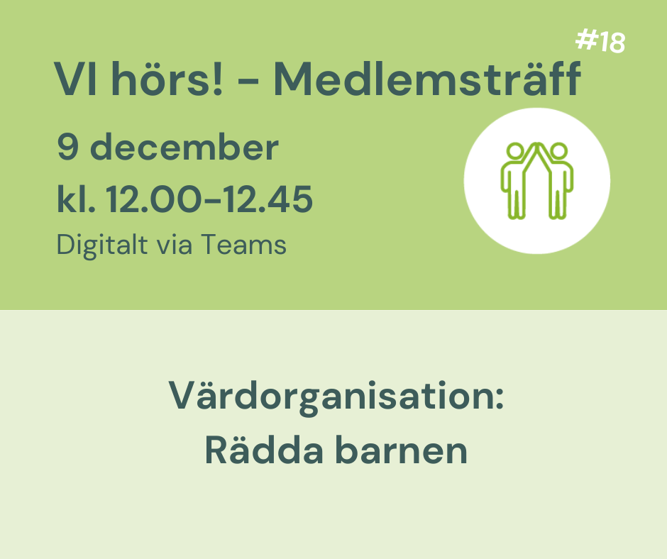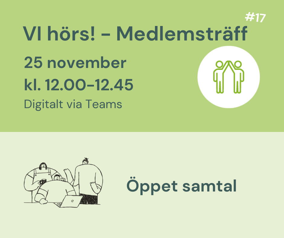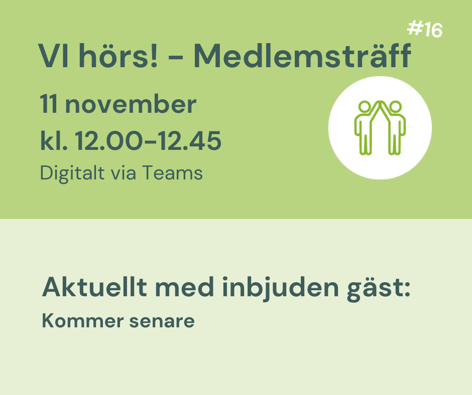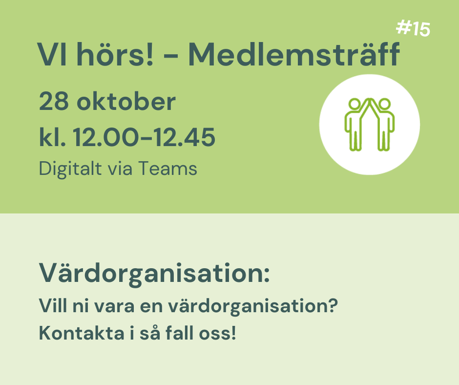 Digitalt via TeamsVälkommen till veckans VI hörs där vi kommer att ha en värdorganisation på plats för att berätta om sin verksamhet. Det kommer även finnas tid för er att ta upp andra frågor som ni vill diskutera. Vill din organisation vara värd för ett tillfälle? Mejla oss på info@varmlandsideburna.se Datum: 28 oktober Tid: 12.00–12.45Plats: Digitalt via Teams: […]