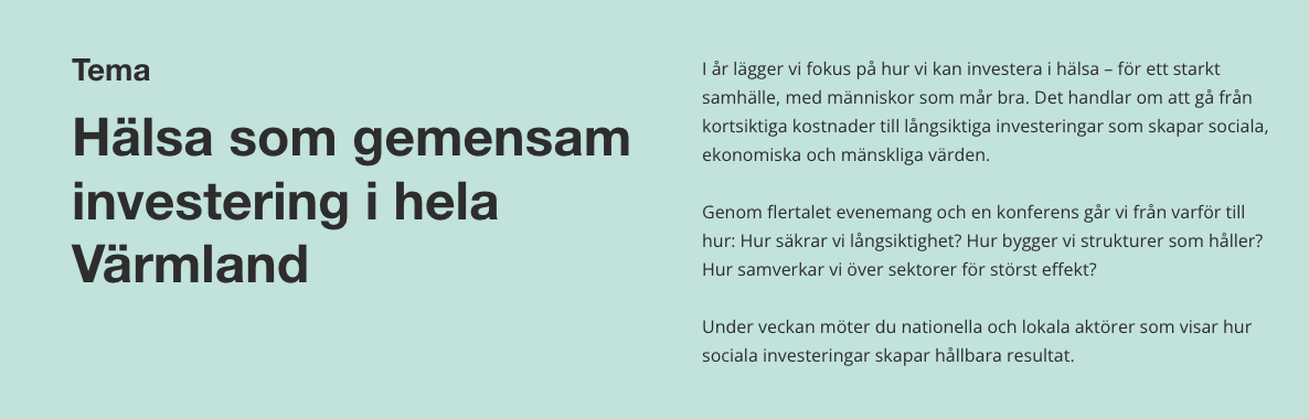Folkhälsoveckan är en mötesplats för kunskap, dialog och samverkan kring framtidens folkhälsa. När: Vecka 17, 20–25 april 2026 Hur: Evenemang, utdelning av folkhälsopriset och konferens Vem: Politiker och andra beslutsfattare, tjänstepersoner i kommuner och region, idéburna organisationer, akademi, näringsliv samt andra med intresse för folkhälsa och samhällsutveckling. Läs mer och anmäl er här Sista anmälan […]